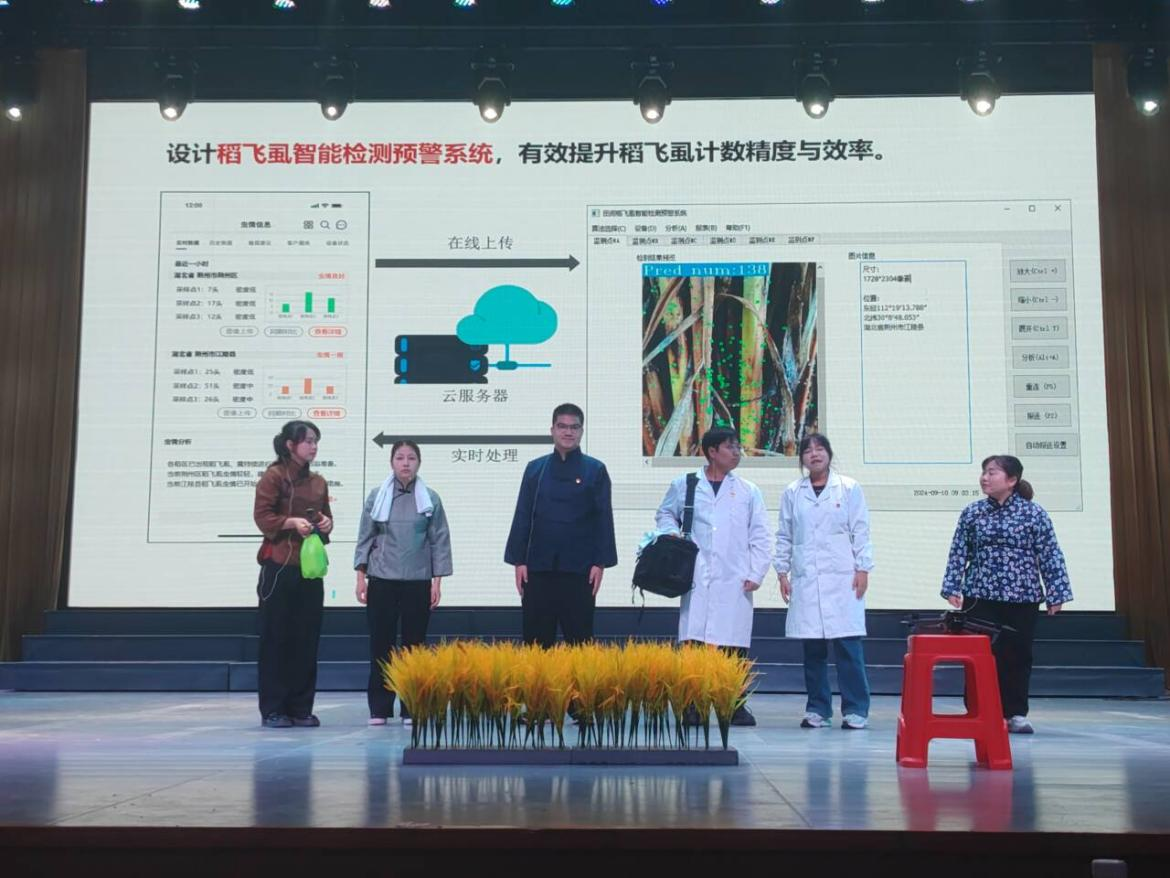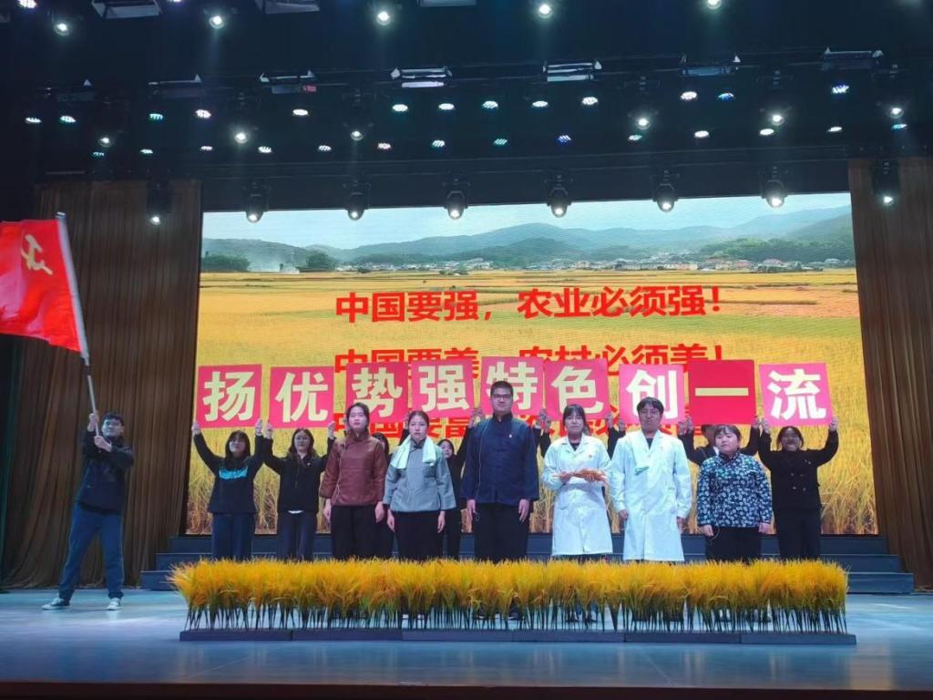 决赛分为支部风采展示与理论知识测试两个环节。在支部风采展示环节,我院以“稻田里的追梦人”为主题,通过多场景展示了支部党员运用智能诊断APP和无人机开展精准作业,帮助村民攻克水稻病害、实现增产增收的完整历程,党员们生动地演绎着关于希望、担当与成长的动人故事,赢得了现场观众的阵阵掌声。