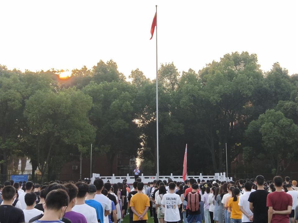 国旗护卫队的旗手们迎着朝阳,以饱满的热情,庄严地护卫着五星红旗来到国旗台下。伴随着激昂的《义勇军进行曲》,鲜艳的五星红旗冉冉上升。全体在场师生注目肃立,心潮澎湃。