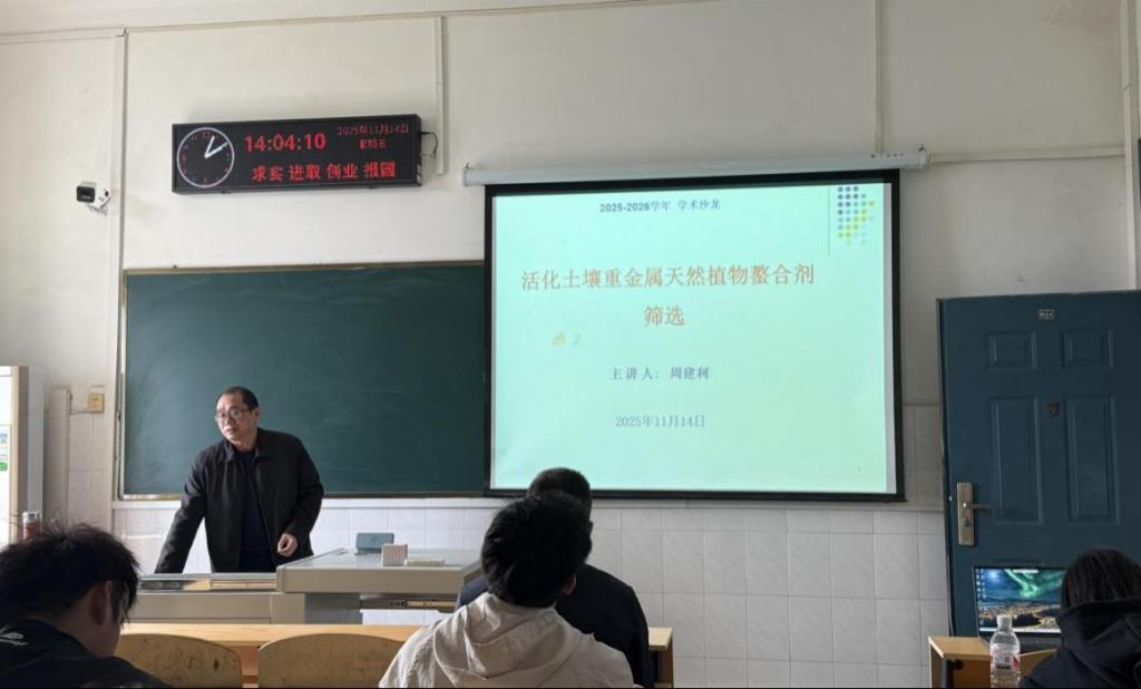 周建利副教授系统介绍了天然植物螯合剂在土壤重金属污染修复中的研究进展。他指出,酸藤果、松树等植物汁液具备较强的重金属活化能力,能够有效提升土壤中重金属的生物有效性,并通过浸提与盆栽试验验证了其在淋洗修复方面的潜力,为绿色低成本土壤修复提供了新思路。