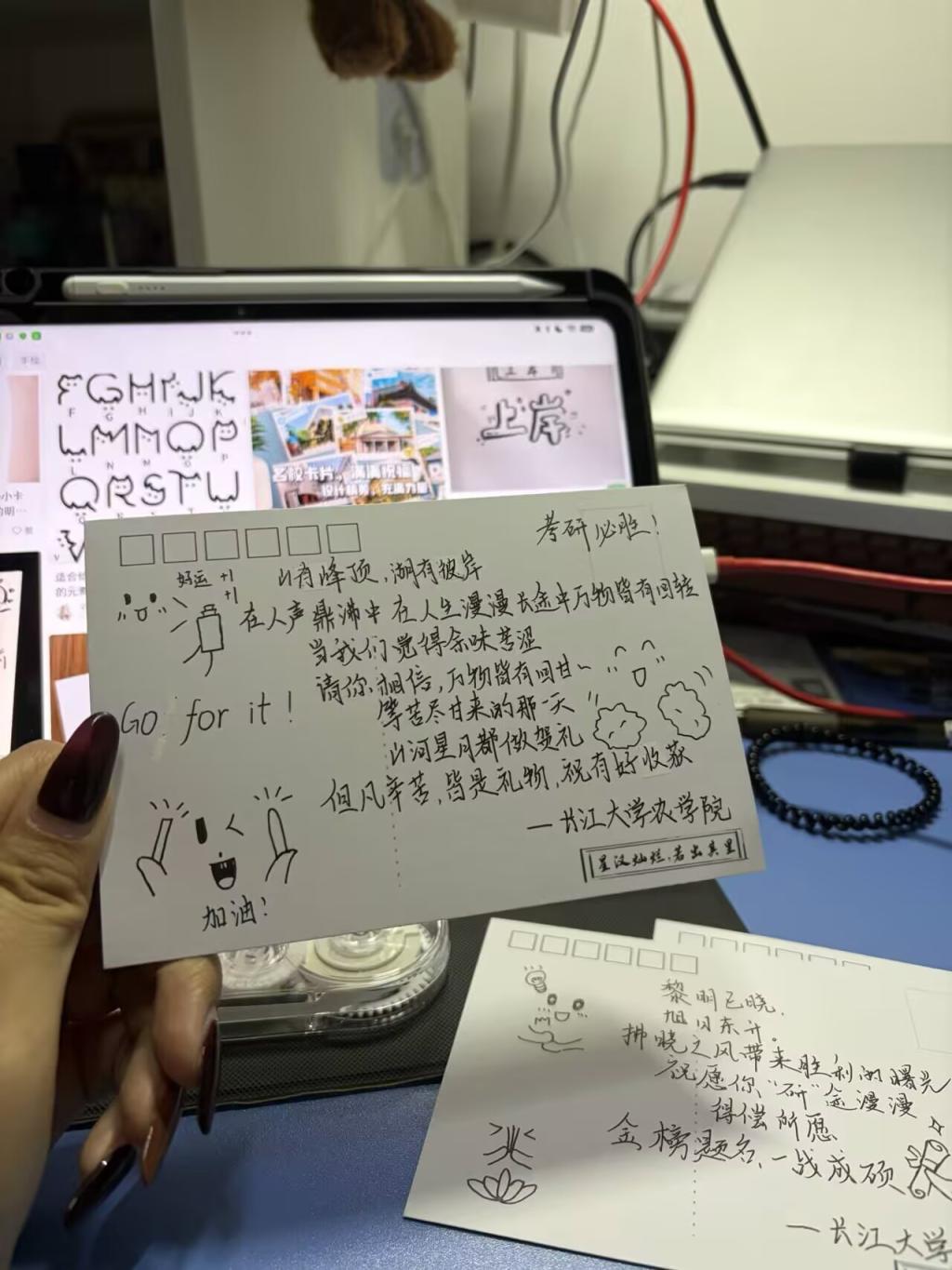 活动尾声,暖心物资发放环节将氛围推向高潮。学院精心筹备的考研物资逐一送到学子手中,实用的文具资料袋、保温水杯承载着学院的贴心关怀,而由学院团委学生会成员手写的祝福卡更显温情,一笔一画间满是学弟学妹们的真挚祝愿与美好期许。现场学子们纷纷表示,此次活动不仅缓解了考前的紧张情绪,更坚定了备考的信心与决心,未来将以更饱满的状态冲刺考研,用优异成绩回报学院的关心与厚爱。