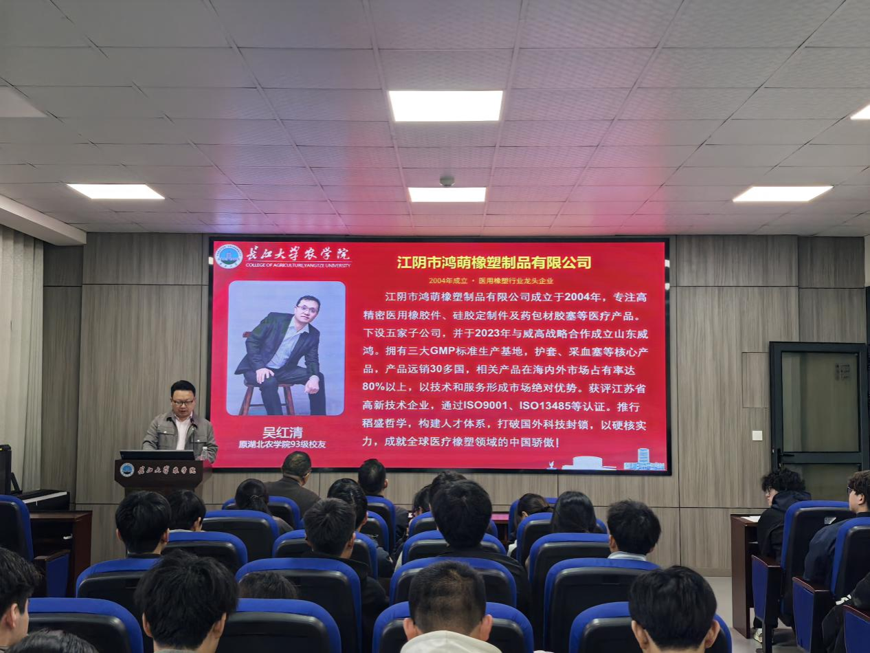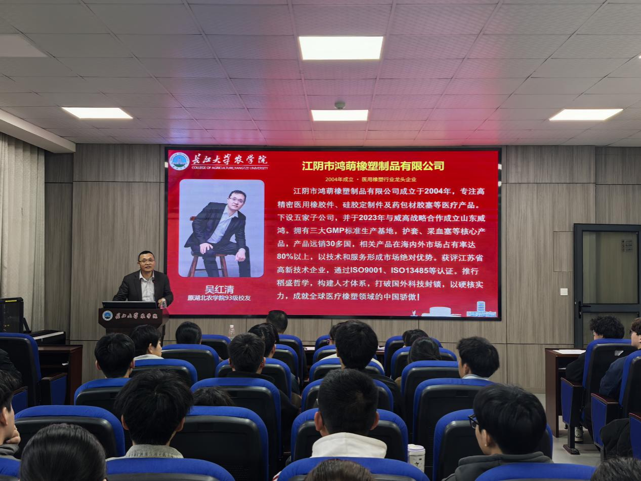 尹小华首先向同学们介绍了吴红清校友所创企业的发展成果。鸿萌橡塑 2004 年成立,深耕医用橡塑领域,现已成为行业龙头,下设五家子公司,与威高集团战略合作成立山东威鸿,拥有三大 GMP 标准生产基地,核心产品远销 30 余个国家,海内外市场占有率超 80%,以硬核技术打破国外封锁,获评江苏省高新技术企业并通过多项国际认证,彰显中国企业的创新实力。